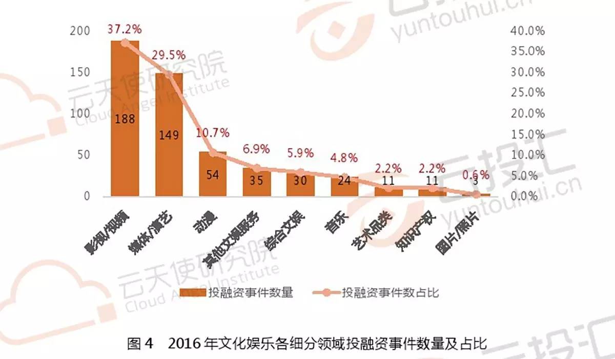 通过对2016年505起文化娱乐投融资事件进行细分梳理,影视/视频、媒体/演艺和动漫在细分领域中居前,分别占比37.2%、29.5%和10.7%。资本市场多集中在能够持续产生优质内容,并且易于变现的细分领域。