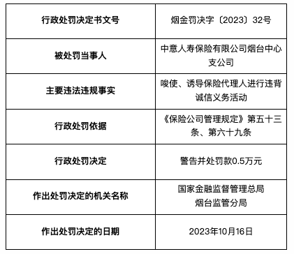 10月23日,国家金融监督管理总局烟台监管分局行政处罚信息公开表显示,2023年10月16日,中意人寿保险有限公司烟台中心支公司因唆使、诱导保险代理人进行违背诚信义务活动,被警告并处罚款0.5万元;时任副总经理(主持工作)张艳青、时任培训岗郭艳荣对上述违法违规行为负有责任,均受到警告并处罚款0.5万元。