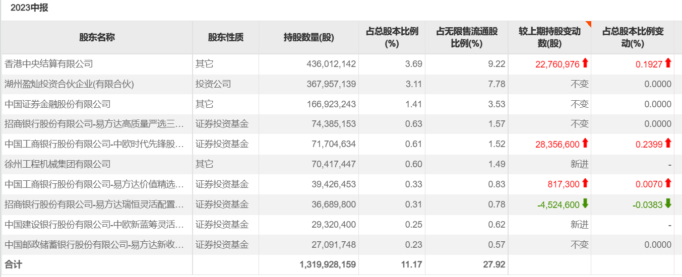从2023年上半年前十大股东看,徐工机械还是以机构持股为主。前十大股东持股比例合计达53.91%。