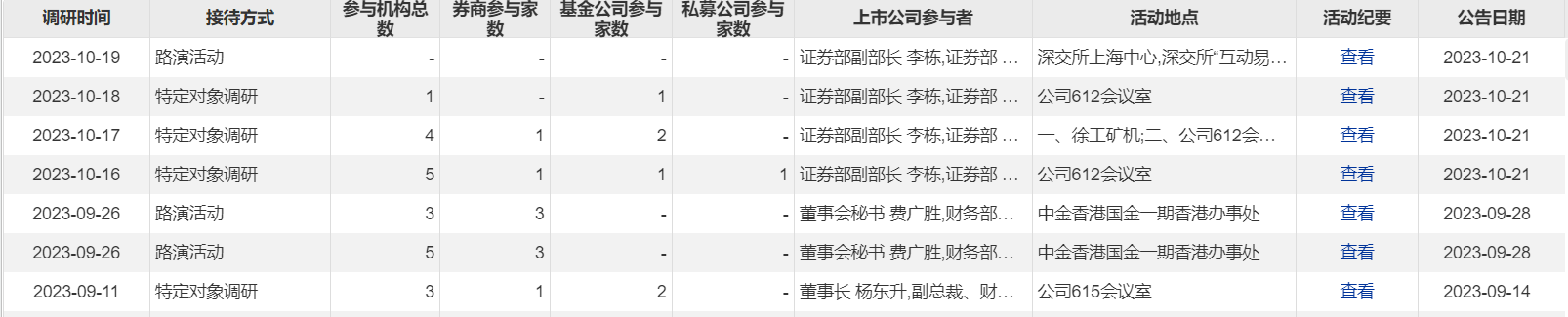 10月16日至19日,徐工机械开展1次路演和3次调研活动,9月开展了2次路演和1次调研活动。