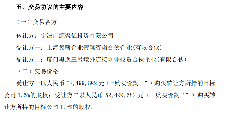 10月17日,良品铺子(603719)公告称,其全资子公司广源聚亿拟将所持宜春赵一鸣食品科技有限公司(以下简称“赵一鸣零食”)3%的股权,以总计约1.05亿元的价格,转让给上海翼嗨企业管理咨询合伙企业(有限合伙)、厦门黑逸三号境外连接创业投资合伙企业(有限合伙),交易完成后广源聚亿不再持有赵一鸣零食的股权。
