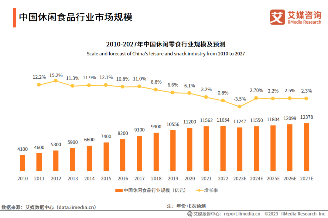 据艾媒咨询发布的《2023-2024年中国休闲食品产业现状及消费行为数据研究报告》显示,从2010年到2022年中国休闲食品行业市场规模持续增长,从4100亿元增长至11654亿元,预计2027年中国休闲食品行业市场规模达12378亿元。