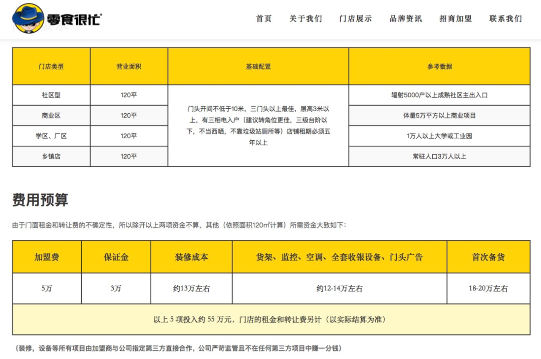 简单算一笔账就可以理解,“趣解商业”通过零食很忙官网的招商加盟内容获悉,加盟商除120平米店面的租金外,初期投入金额(包括装修、门店陈设、备货等)需要55万元,其中规定每家门店都要缴纳5万元加盟费,如从现有的3000家门店推算,零食很忙仅加盟费就有1.5亿元。