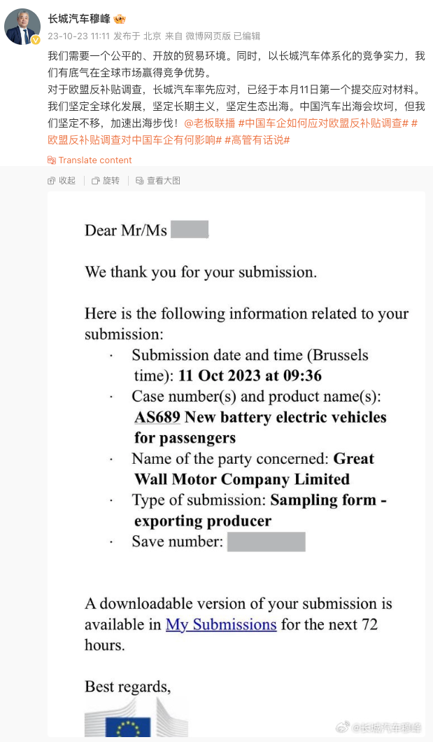 10月23日,针对欧盟委员会决定对进口自中国的纯电动载人汽车发起反补贴调查一事,长城汽车总裁穆峰表示,长城汽车率先应对,已经于本月11日第一个提交应对材料。“我们需要一个公平的、开放的贸易环境。同时,以长城汽车体系化的竞争实力,我们有底气在全球市场赢得竞争优势。”穆峰表示。