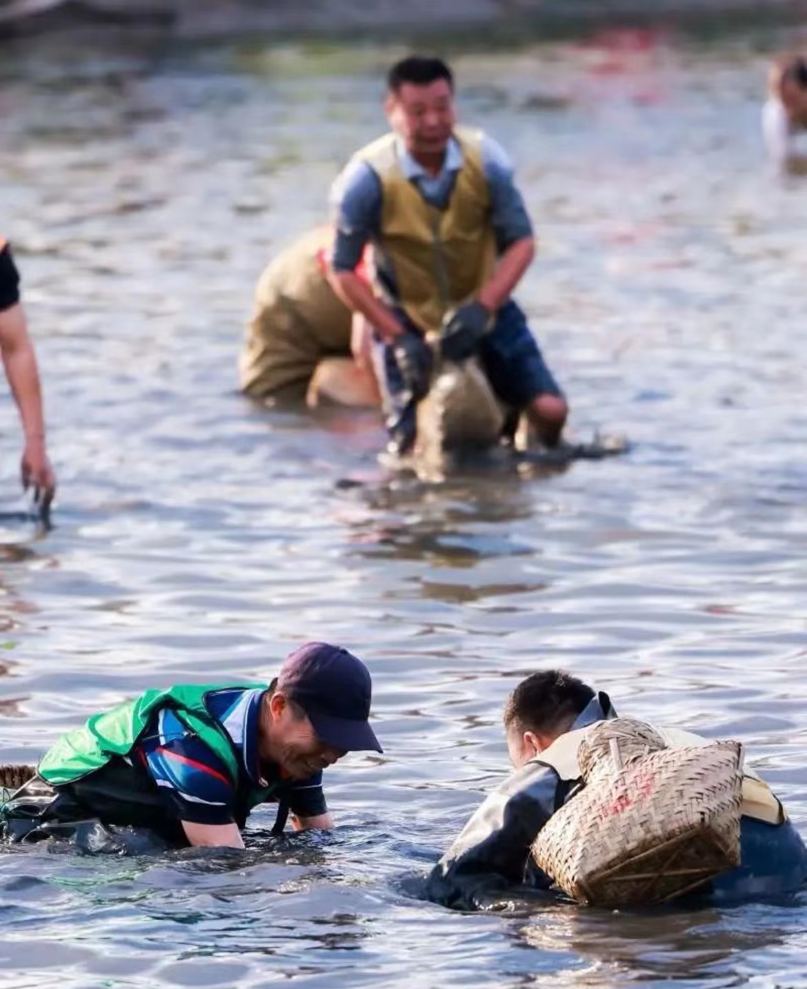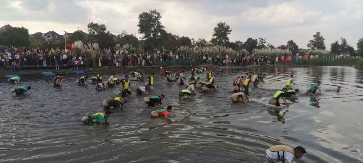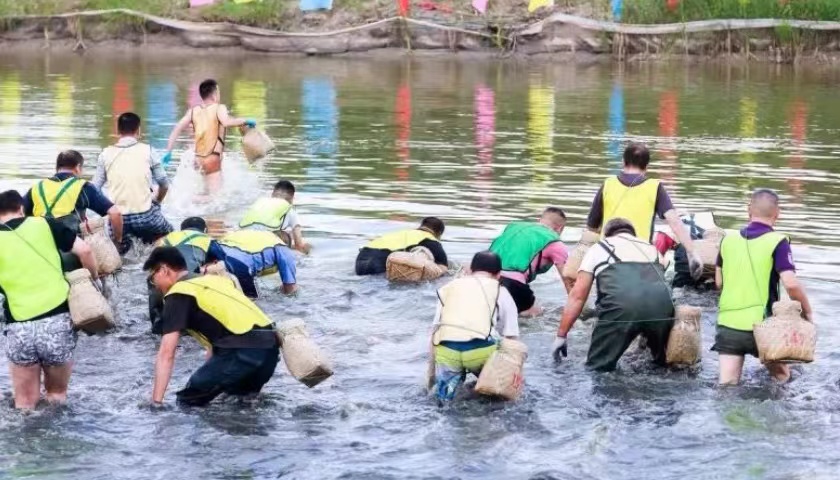 随后的捕蟹比赛将活动推向又一个高潮,随着主持人高喊:“开捕咯!”参赛选手们背上小竹篓,齐刷刷地冲向蟹塘。伴着舞龙舞狮的激昂鼓点,队员们自发分工协作“拦截的工作由你负责,伸手的任务交给我”,眼疾手快的队员们迅速出击。没过多久,他们就收获了多只肥美的螃蟹。岸边观赛的人们同样热情高涨,他们为参赛选手们加油鼓劲,为选手们的精彩表现欢呼雀跃。