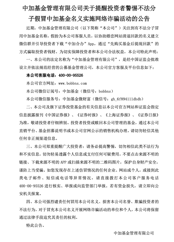 10月23日,中加基金公告称,近期关注到有不法分子冒用中加基金名称,假扮为公司客服人员,以协助婚恋网站清退回款的名义建立微信群并引导投资者下载“中加合办”APP,通过“先购买基金后提现回款”的方式骗取投资者钱财。中加基金提醒投资者,请务必提高警惕,切勿相信此类不法行为和不实信息,切勿轻易透露个人信息或支付任何可疑费用,不要点击来源不明的链接、下载来源不明的APP或扫描来源不明的二维码图片,保护自身财产安全,谨防上当受骗。