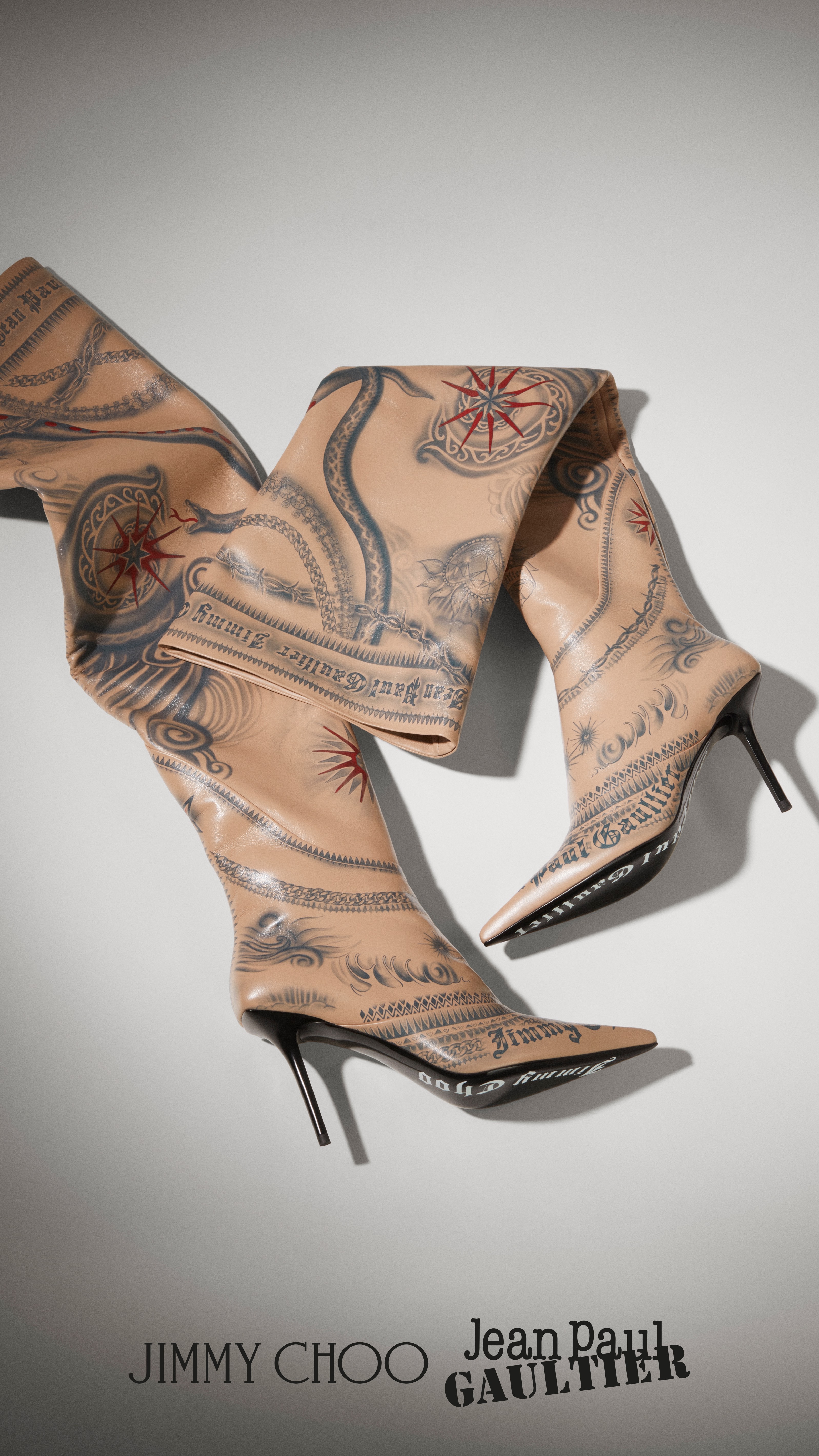 联名合作系列过膝靴柔软的纳帕皮革之上,各种纹身图案幻化而成的精美印花嵌入其中,这一设计灵感源自Gaultier引领潮流的1994年春夏高级时装“Les Tatouages”系列的品牌经典纹身图案。