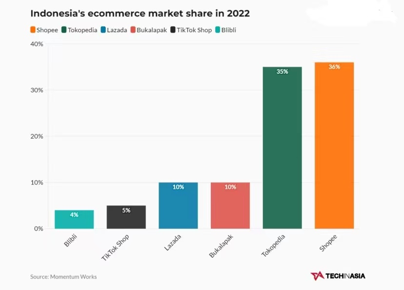 据Tech in Asia数据,印尼市场主要有三大电商平台:Shopee、Tokopedia和Lazada,2022年三大电商在印尼市场份额分别为36%、35%、10%,TikTok Shop只占5%市场份额。