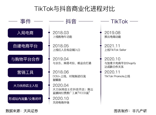 由于参照抖音电商的发展策略,TikTok Shop正逐渐完善其商业闭环。据非凡产研报告分析,从发展阶段来看,TikTok已完成了抖音在2018-2019年的动作,当前商业化的阶段大约相当于两年前的抖音。