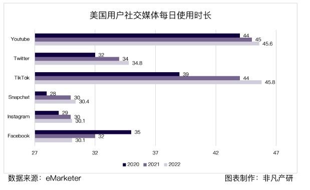 据eMarketer统计,美国用户平均每天玩TikTok时间持续增长,从2020年的39分钟增加到2022年的45.8分钟,已经超越Youtube、Twitter的使用时长,成为美国用户最受欢迎的社交媒体。当前,TikTok内容病毒式传播已经成为一种文化现象,尤其广受年轻人的喜欢。