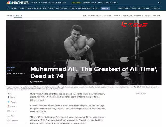 2016年6月3日,“在与帕金森症战斗了32年之后,74岁的阿里去世了。”