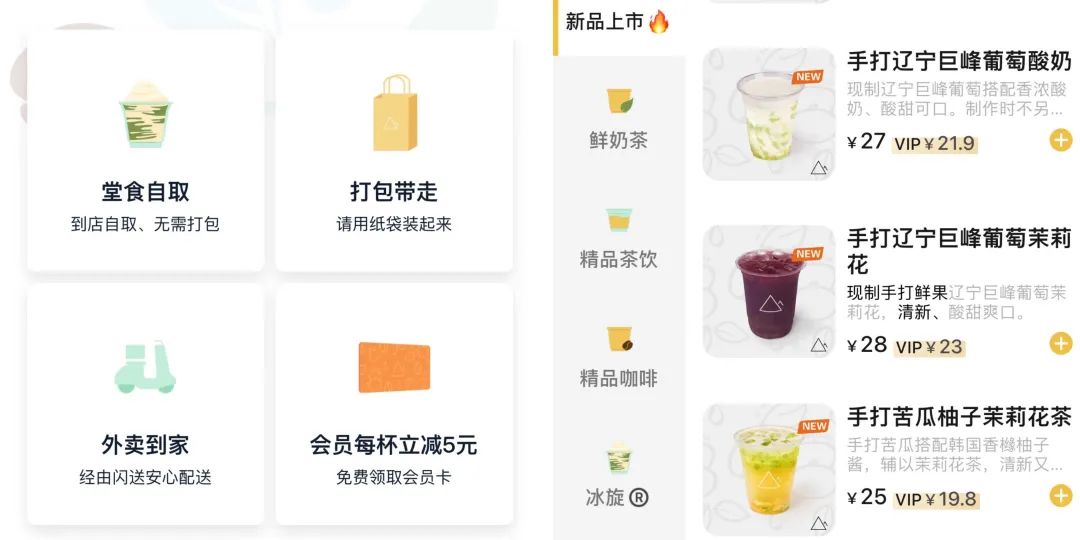 进入小程序,能看见“会员每杯立减5元”的字样,下方还有“免费领取会员卡”小字。只需免费领取一张会员卡,看似定位20元、30元的饮品,用10元~20元就能买到。