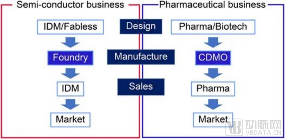 尽管半导体行业与制药行业的产品完全不同,但两个行业都承受着新产品和生产技术研发成本增加的负担。在生物制药行业之前,半导体行业在80年代就建立了横向分工模式,半导体行业的发展和技术平台的历史为生物制药 CDMO 行业的关键成功因素提供了见解。