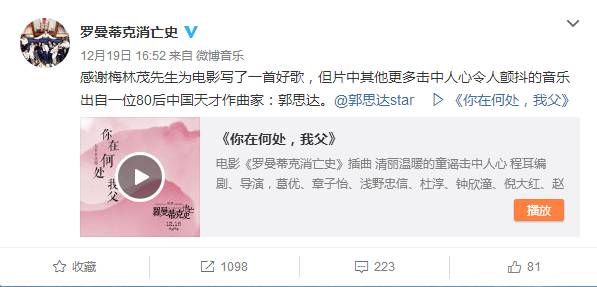 据悉,导演程耳对配乐要求极其严苛,前后找人配乐了好几次但都不是很满意,最终直到11月30日才完成最终音乐,而《罗曼蒂克消亡史》也因此遗憾错过了第53届金马奖的评选。