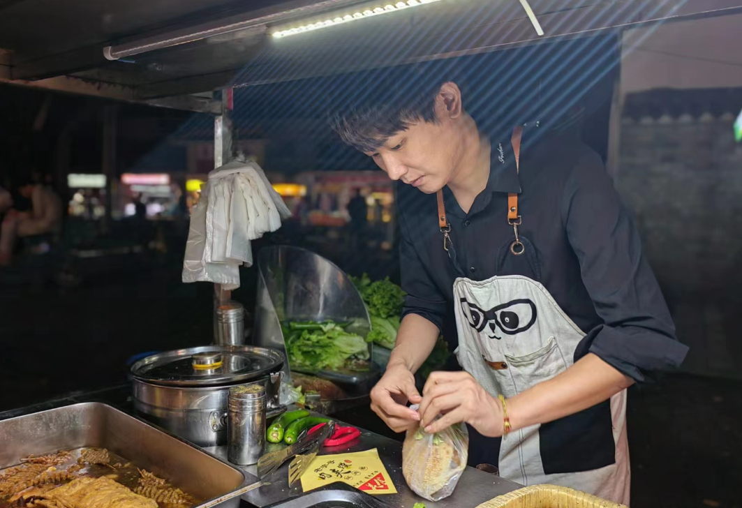 这是方圆几里最热闹的夜市街,分布的流动摊位有100多家,云集了所有能想到的美食小吃。叶树林告诉时代周报记者,能保证烧饼销量的,一是独家性,夜市里卖烧饼的只有他这一家;二是通过短视频账号“烧饼俊杰”引流,吸引了不少同城食客,“几乎贡献了销量的一半”。