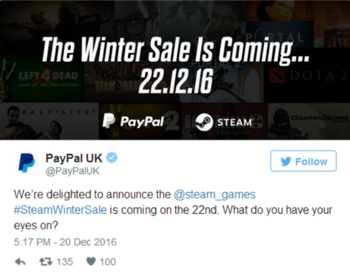 PayPal英国于12月20日早间在其推特账号上发布了一条关于Steam促销活动的状态,文中说道:“我们非常欣喜地宣布Steam游戏冬季大促销将在12月22日开始,你准备好自己的选购目标了吗?”