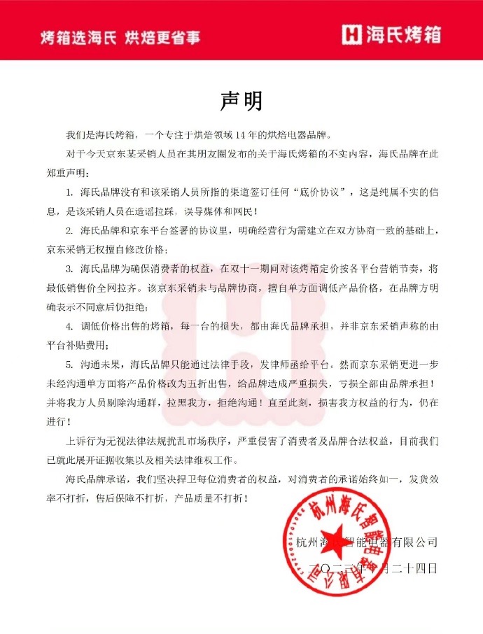 10月24日,海氏品牌发布声明称,没有和京东某采销人员所指的渠道签订任何“底价协议”,信息不实。京东采销未与品牌协商,擅自单方面调低产品价格,在品牌方明确表示不同意后仍拒绝。调低价格出售的烤箱,每一台的损失,都由海氏品牌承担,并非京东采销声称的由平台补贴费用。目前,公司已就此展开证据收集以及相关法律维权工作。