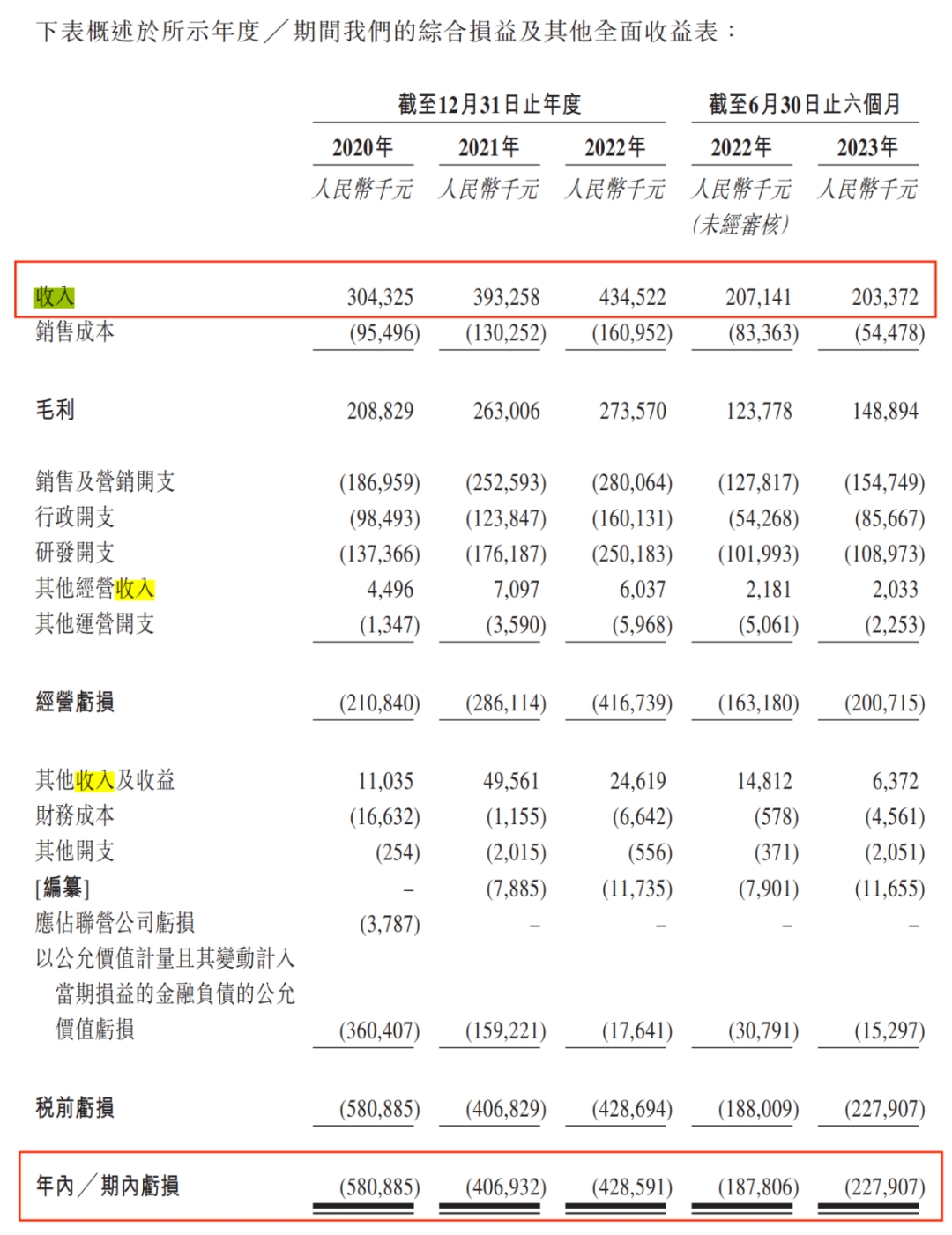 招股书显示,2020年-2023年6月,其收入分别为3.04亿元、3.93亿元、4.35亿元、2.03亿元;利润亏损5.81亿元、4.07亿元、4.29亿元、2.28亿元。