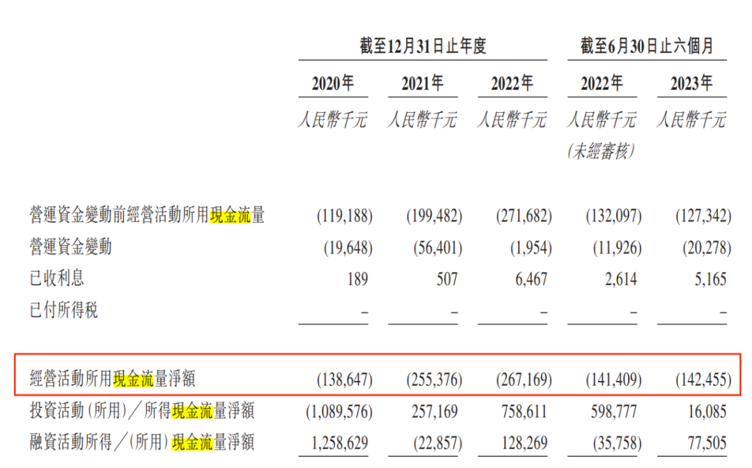 招股书显示,2020年-2023年6月,臻和科技的经营现金流分别为-1.39亿元、-2.55亿元、-2.67亿元、-1.42亿元。