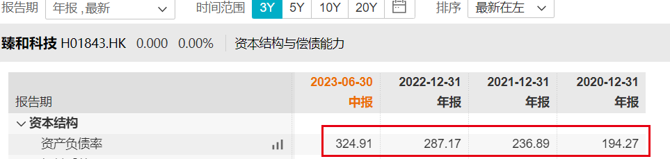 不仅如此,臻和科技的资产负债率越来越高。2020年-2023年6月,其资产负债率分别为194.27%、236.89%、287.17%、324.91%,其流动性风险由此可见一斑。