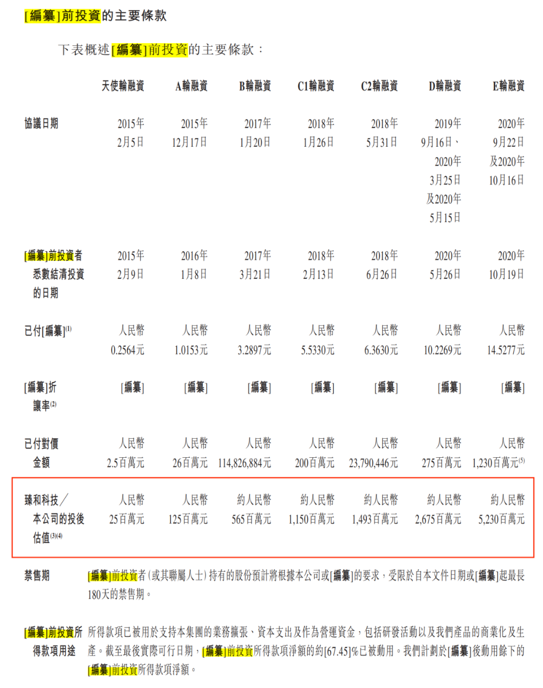 臻和科技的确获得了多轮融资。招股书显示,自2015年至2020年,其共获得7轮融资,投后估值从2500万元上涨到52.3亿元。