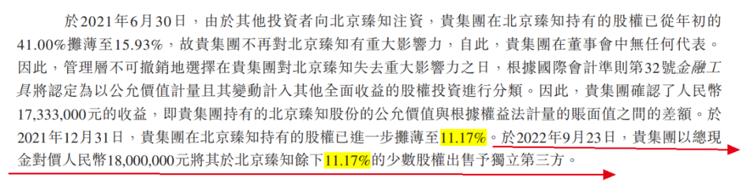 但双方最终“分道扬镳”。招股书显示,于2022年9月,集团以1800万元转让北京臻知11.17%股权退出。