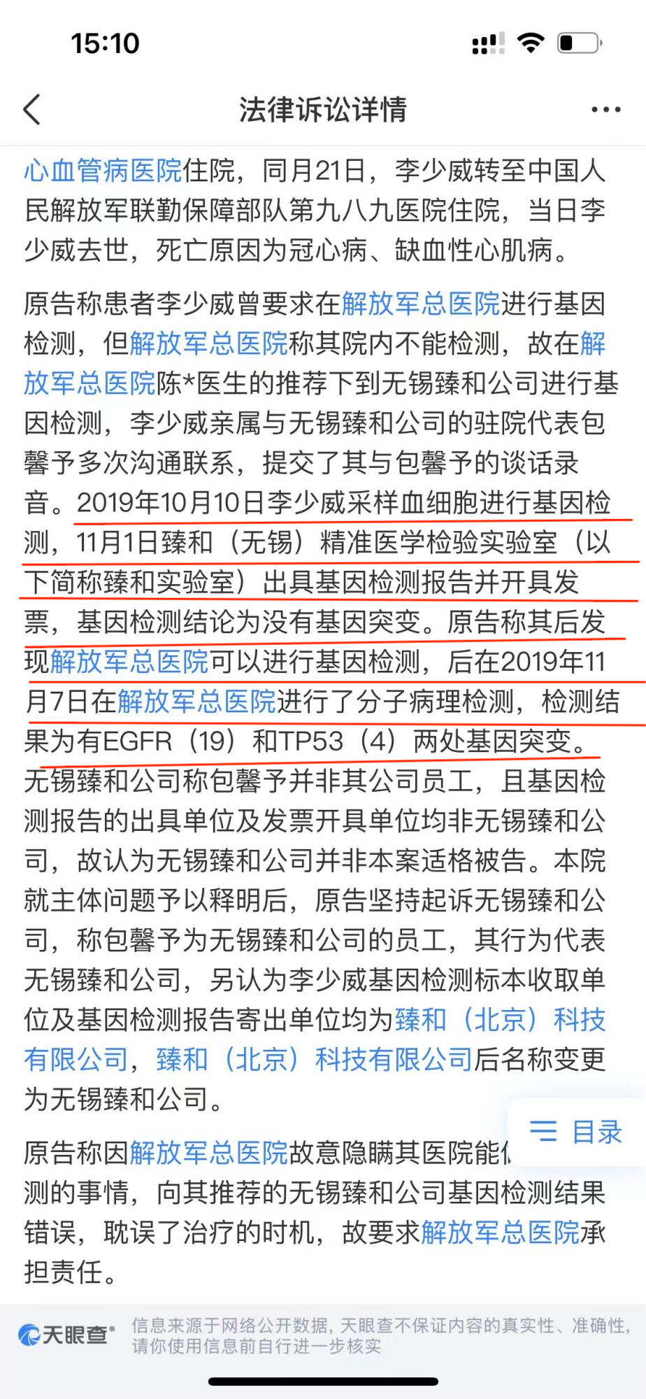 天眼查显示,2019年,一位李姓患者因右上肺腺癌在医院手术,术后于院外进行了基因检测,臻和(无锡)精准医学检验实验室(以下简称:臻和实验室)出具检测报告,结论显示无基因突变。紧随其后,患者在医院所做的基因检测结果显示有两处基因突变。后因种种原因,该患者最终病故。