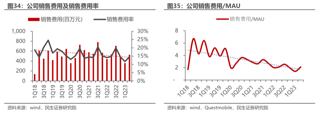买量主要为广告投放,通过去热门平台买量,扩充用户接触面积。芒果TV的买量支出控制较好,绝对值维持在单季度5亿元左右,销售费用率、销售费用/MAU呈波动下降态势。