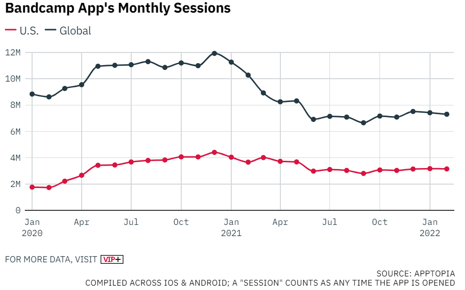 据美国市场研究公司Apptopia报道,Bandcamp App的全球使用量和美国国内使用量在2020年12月开始十分明显地由涨转跌,从2021年6月开始,Bandcamp App的月活停止了下跌,但在此后的几个月里也不再增长,一直维持在700万左右,不到其巅峰状态的70%,甚至低于其2020 年 3 月之前的水平。