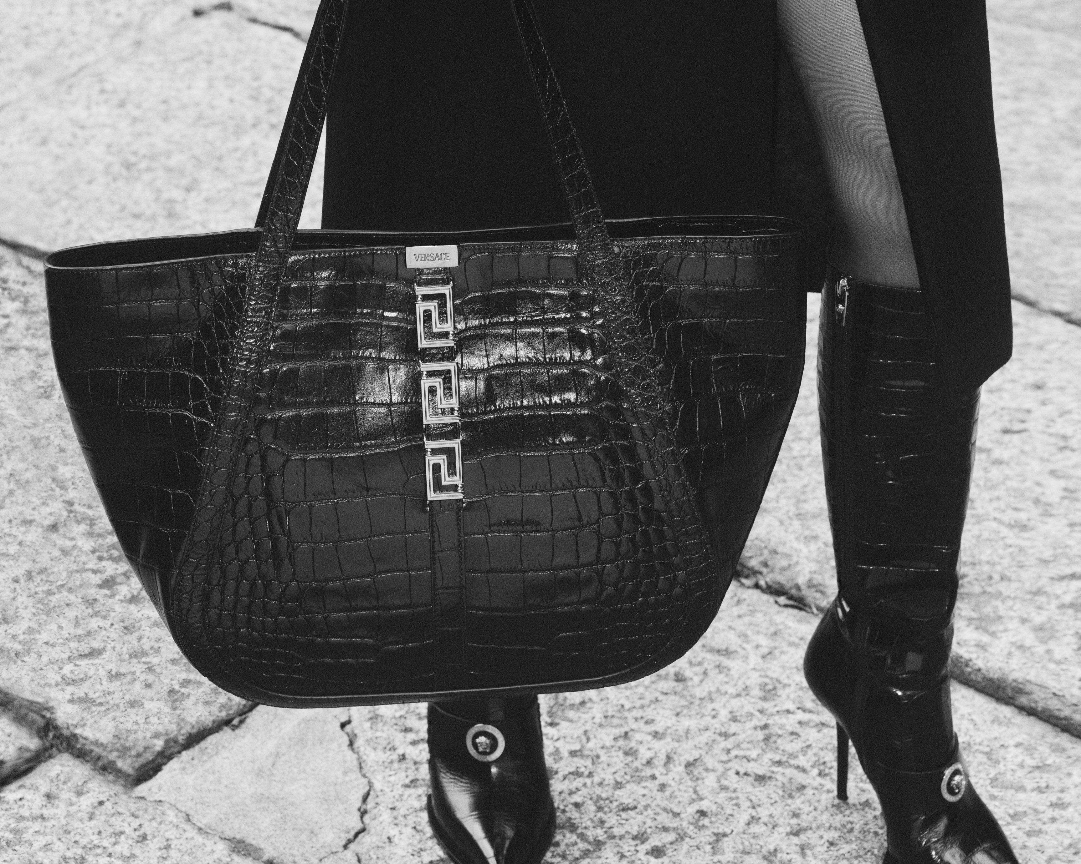 Versace Greca Goddess包袋家族再添新成员。全新Versace 2023秋冬系列托特包,传承意大利匠心工艺与结构化设计。