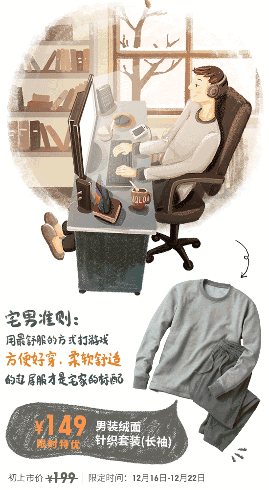 如优衣库在邮件营销新品推荐时, 主要是几款基础家居服,除了细分性别,还根据不同人群特性,以动态邮件形式再现生活场景,以居家的惬意舒适场景,衬托服饰的舒适感。