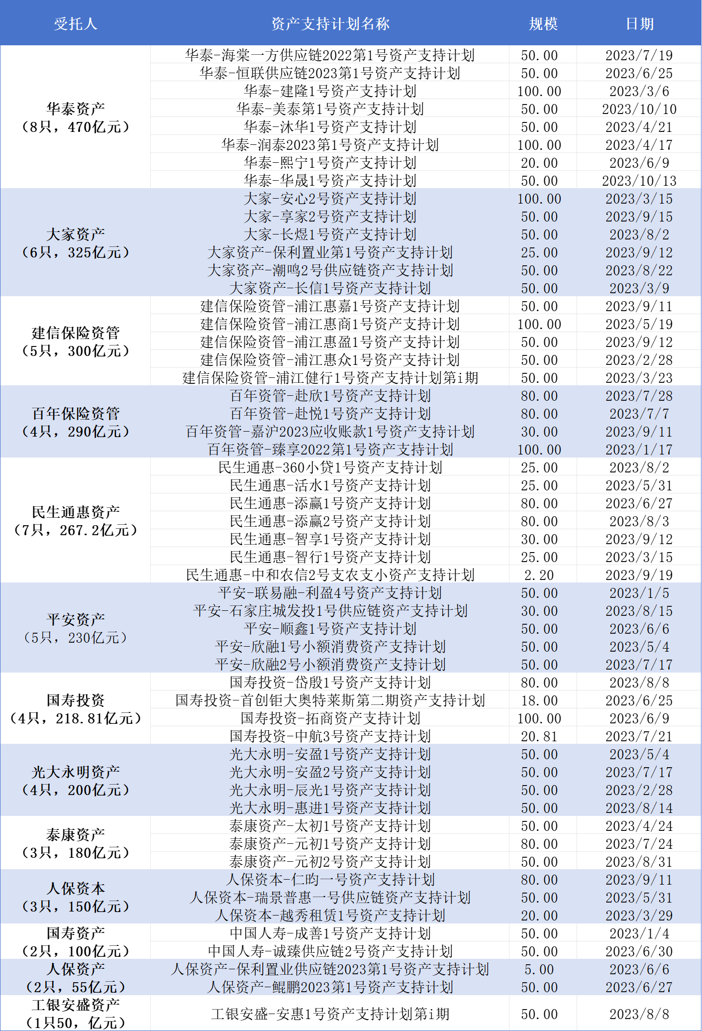 此外,百年保险资管、华泰资产、大家资产、建信保险资管和国寿投资登记的单只资产支持计划规模均为100亿元,为年内单只最大创设规模。