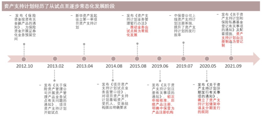 不过,伴随近年来政策端的持续发力,资产支持计划的发展已逐渐驶入快车道。2019年6月,原银保监会发文确立资产支持计划实行“初次申报核准、后续产品注册”制度;2021年9月,银保监会进一步将资产支持计划调整为“初次申报核准、后续登记制度”,注册制到登记制的改变,也大大提升了“险资版ABS”的发行效率。