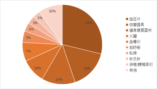 此外,根据有关统计,我国家用医疗器械市场主要集中于血压计、血糖仪等家用检测器械、按摩器具、健身康复器材等家用医疗康复器具,这些传统的家用医疗器械占据了整体市场近7成。