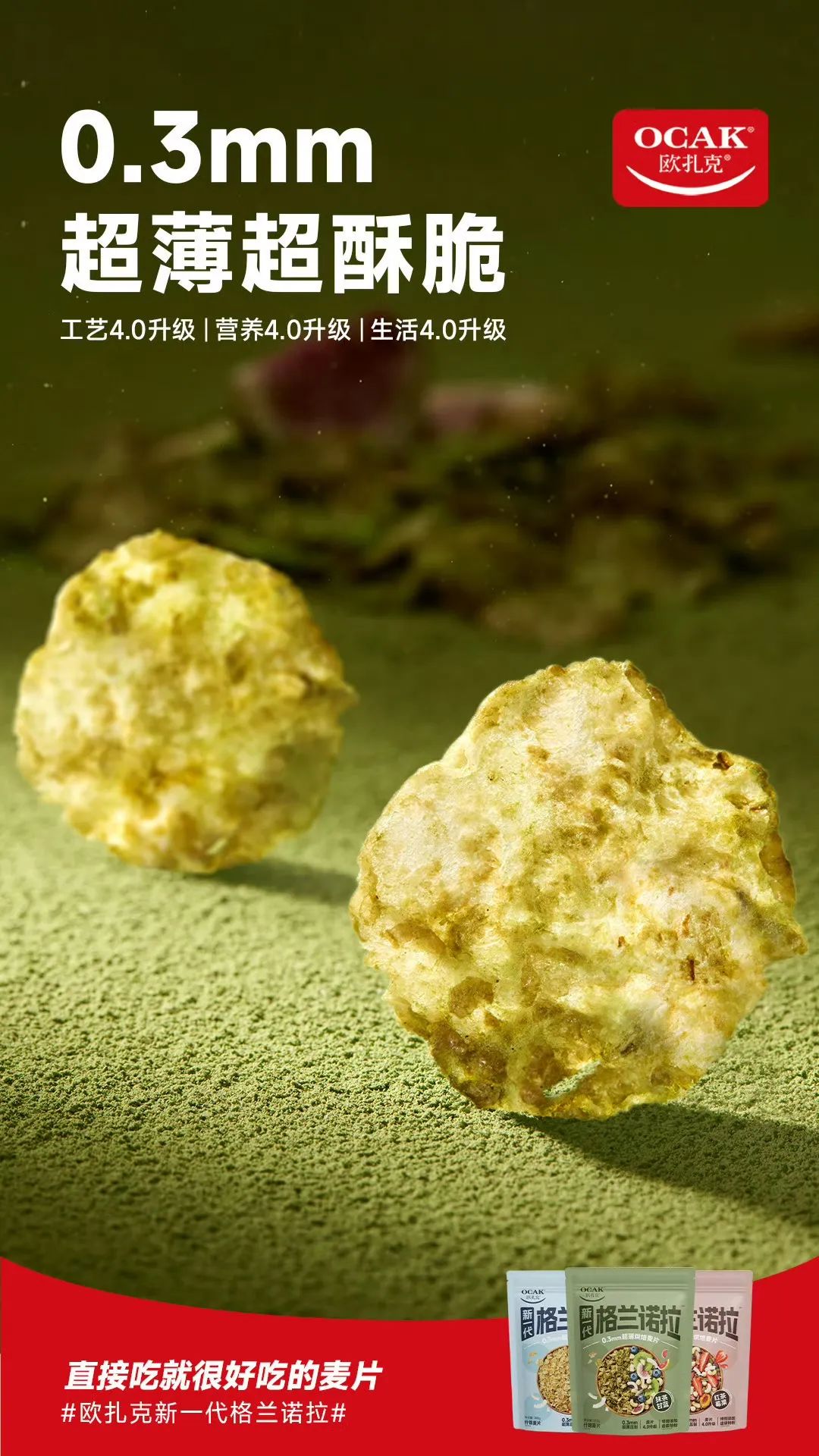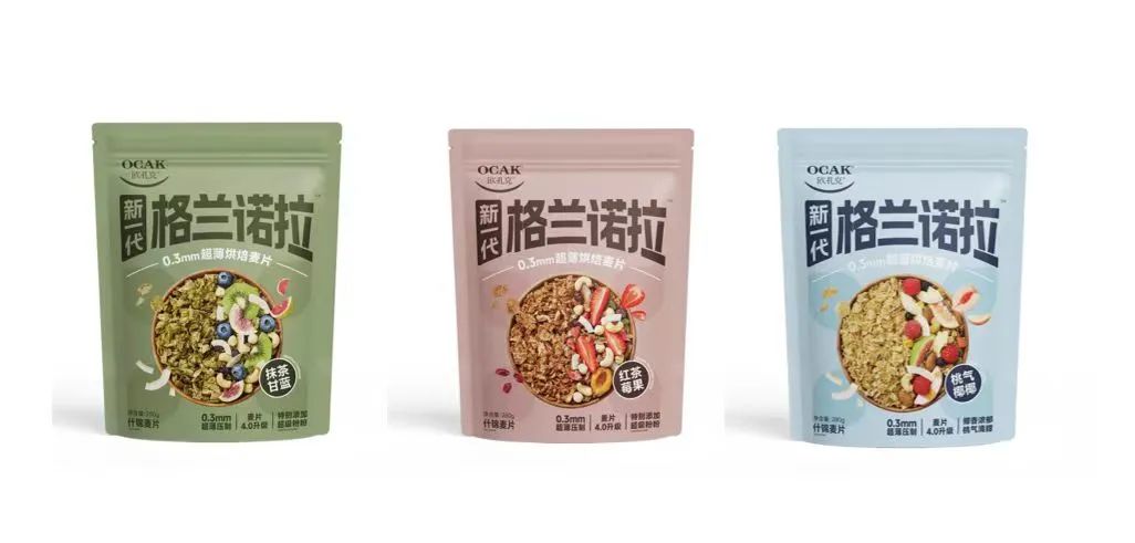在原料上,新一代格兰诺拉打造出干净的配料表,以“全谷物+超级谷物”的组合为主,不含蔗糖、香精、色素防腐剂。同时欧扎克打造了抹茶甘蓝味、红茶莓果味、桃气椰椰味三种口味,带来多样化的选择。