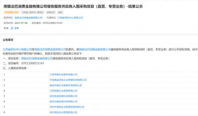 01、南银法巴消金:入围的催收服务供应商高达59家