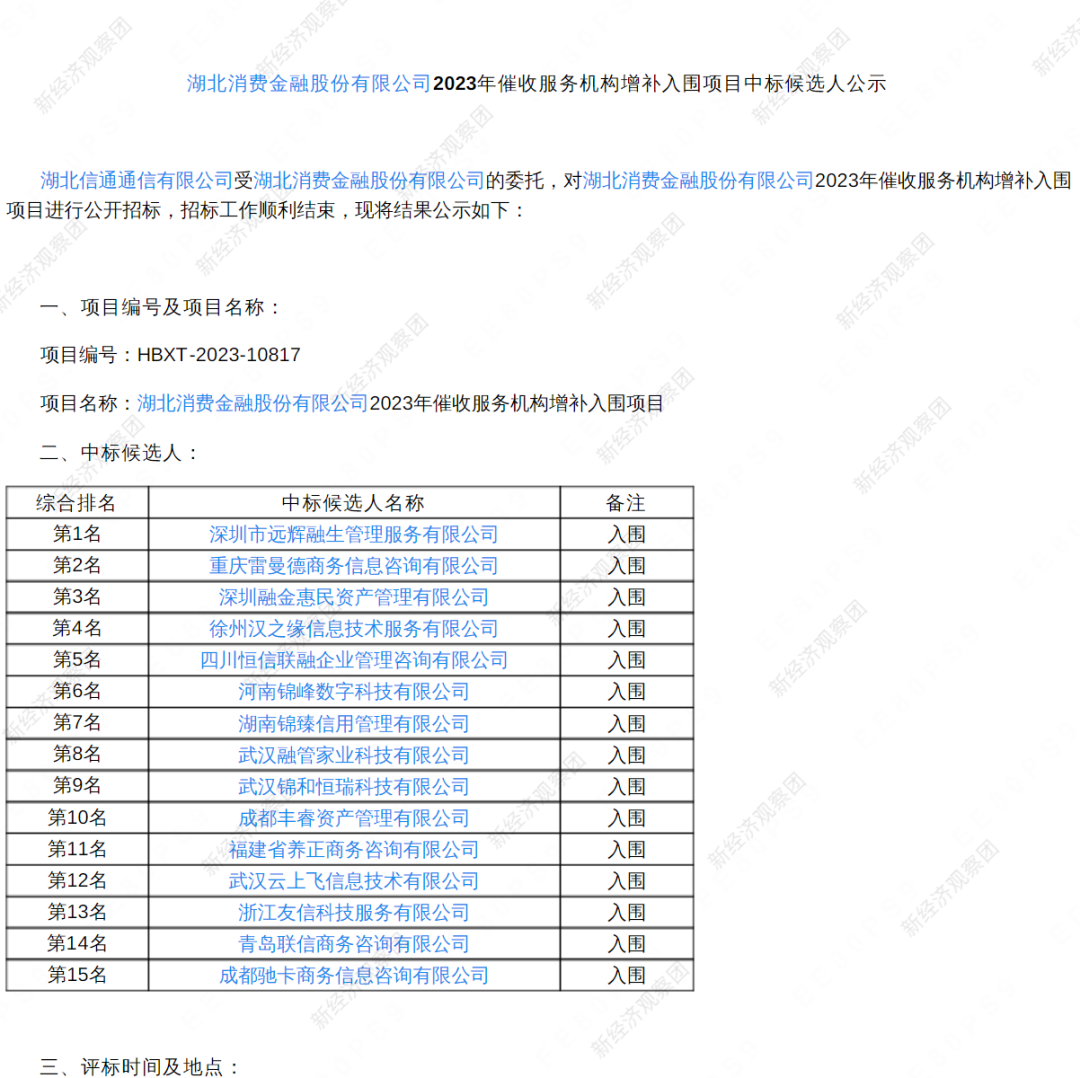 其中,5月份的《湖北消费金融股份有限公司2023年催收服务机构增补入围项目招标中标候选人公示》显示,有深圳市远辉融生管理服务有限公司、重庆雷曼德商务信息咨询有限公司、武汉锦和恒瑞科技有限公司、成都丰睿资产管理有限公司、福建省养正商务咨询有限公司、武汉云上飞信息技术有限公司、浙江友信科技服务有限公司、青岛联信商务咨询有限公司、成都驰卡商务信息咨询有限公司等15家催收机构增补入围。