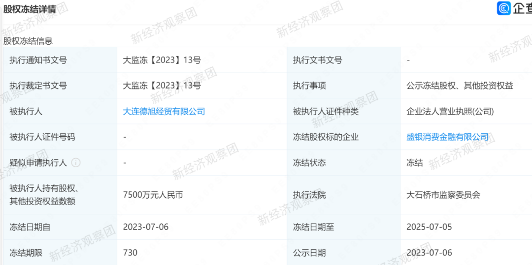 目前,盛银消金的第二大股东大连德旭经贸有限公司所持有的相关股权已被冻结,冻结金额为7500万元,冻结期限为两年。