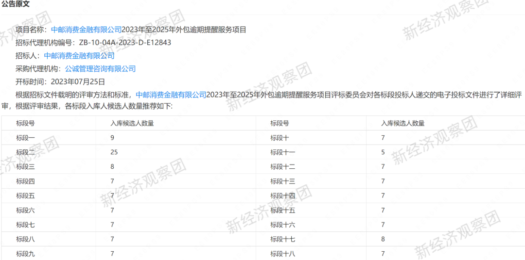 第四家有公布委外催收项目公告的是中邮消费金融有限公司。根据今年7月31日公布的《中邮消费金融有限公司2023年至2025年外包逾期提醒服务项目入库候选人公示》,共18个标段的超百家机构成为外包逾期提醒服务候选人,去重后候选机构数量约为99家。