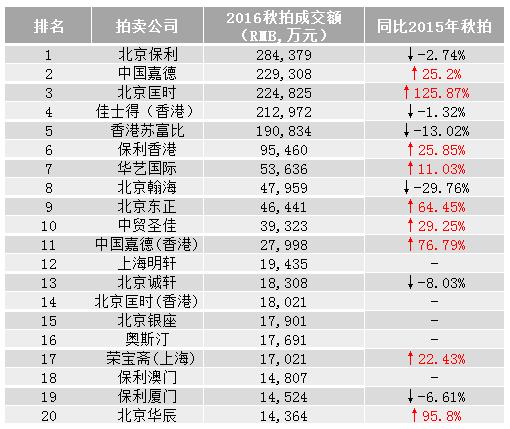 据雅昌艺术市场监测中心的不完全统计,截止到12月13日,北京大部分拍卖行已经落幕,南方拍卖则稍晚,从目前统计情况来看,北京地区整体表现值得赞赏。在2016秋季大拍拍卖公司成交额TOP20榜单中可见,北京地区共计上榜9家公司,其中5家拍卖行(中国嘉德、北京匡时、北京东正、中贸圣佳、北京华辰)成交额同比去年同期有所提升,其中3家拍卖行涨幅明显:北京匡时涨幅达125.87%,北京华辰、北京东正涨幅分别为95.8%、64.45%。略有下调的拍卖行有北京保利,下调2.74%、北京诚轩8.03%,基本保持在合理的震荡范围。保利拍卖执行董事赵旭在接受雅昌艺术网采访时表示“和2015年度相比较,我们保利拍卖的数量总体下降是在两成左右,其中尤其是北京保利秋拍的数量下调比例是最大的,应该说是11年以来,中国传统书画数量最少的一次。但是据我所知,我们拍品的数量调整比例相对于其他拍卖公司来讲算是少的,国内的其他拍卖公司甚至是去掉了某个门类的拍卖,主要拍卖中国书画。”从去年开始,南方拍卖行突飞猛进,内地南北方拍卖公司之间的差距逐步缩小。截止到目前南方艺术市场尚未完全结束工作,数据收录不全面,其在今秋的表现还请拭目以待。