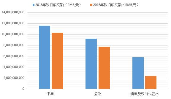 从雅昌艺术市场监测中心目前的数据统计来看,书画、瓷杂、现当代艺术及其他三大板块均呈现下滑趋势。中国书画作为中国艺术品拍卖市场的支柱,不论是古代书画还是近现代书画,本季度都给出了不错的成绩单。各个拍卖行业也着力打造自己的明星专场,如北京保利、中国嘉德的书画大观之夜、北京匡时的“澄道”与“畅怀”中国书画夜场。南方拍卖行多以书画为主,本次书画的下滑不排除南方拍卖行数据尚未完全统计。