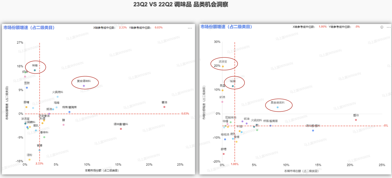 年轻消费者对健康和便捷的双重需求也体现在了调味品市场的近期动态之中。可以看到,在调味品这一品类中,复合调味料作为便捷、美味的一站式调味品,持续两个季度受到消费者的青睐;而兼具方便快捷属性的浓汤宝,在第三季度的增长表现也十分突出;此外,经历了长期的低迷之后,味精在近两个季度中表现出复苏迹象。