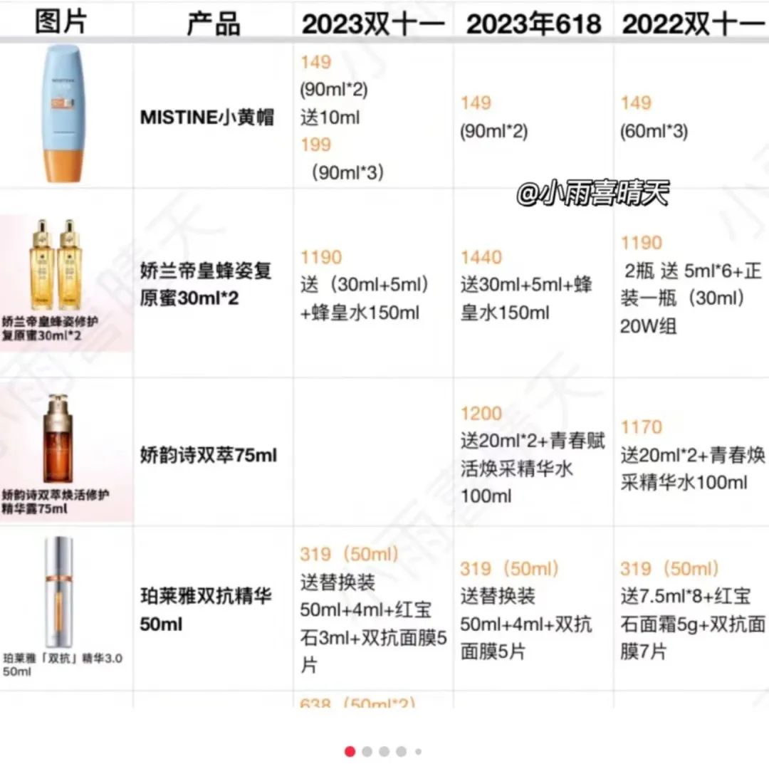从上述博主发布的价格对比中可以看到,购买1190元2瓶30ml娇兰帝皇蜂姿复原蜜,去年双11送5ml*6的黄金复原蜜和30ml正装,而今年,同样的产品和价格配赠35ml同款正装加150ml蜂皇水。