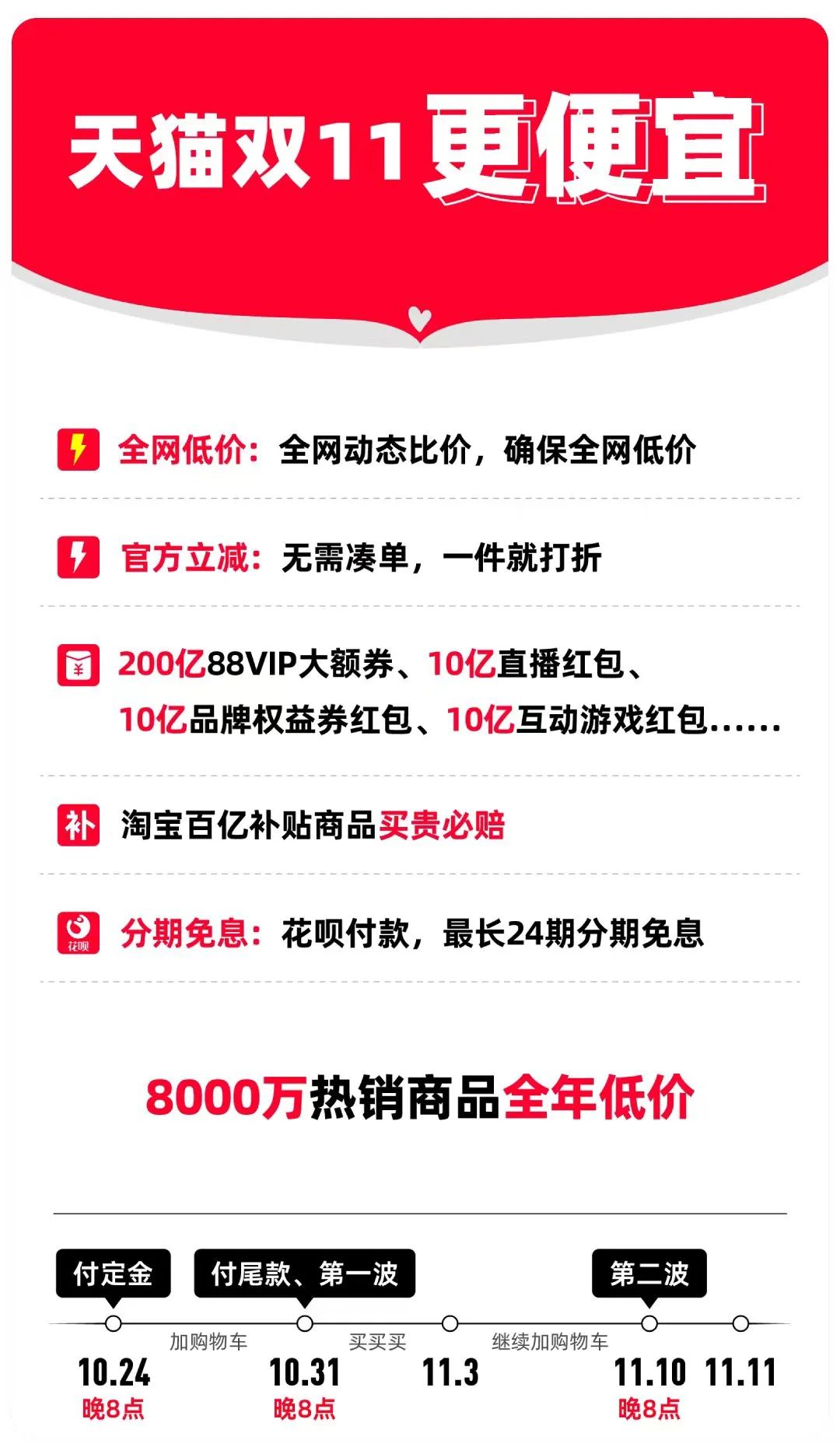 除此之外,天猫将投入20亿激励品牌商家,淘宝也为新商家提供20亿流量推广补贴。平台预计,将有超过8000万热销商品降至“全年最低价”。