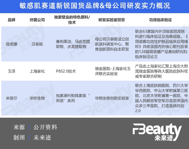 目前,在激烈的市场竞争中,敏感肌护理市场的几个新锐国货头部品牌或有着“医研共创”的专业背景,如薇诺娜、玉泽等;或依托母公司的强大研发体系与研发积累,如米蓓尔。这也是新锐国货之所以能够被消费者认可,甚至超越外资品牌并成为头部品牌的原因。