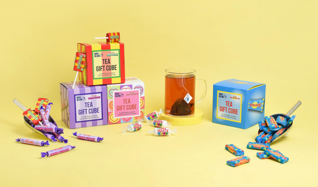 今年, 来自英国的茶品牌Bird &Blend 与糖果品牌 Swizzels联名,推出一组以糖果为灵感的茶。这些茶以 Swizzels 产品系列中广受欢迎的爱心糖、提神糖、帕尔马紫罗兰糖和棒槌棒棒糖糖果口味为基础,在茶味中混合了香草、鲜花、水果等成分,最大化还原糖果的味道。