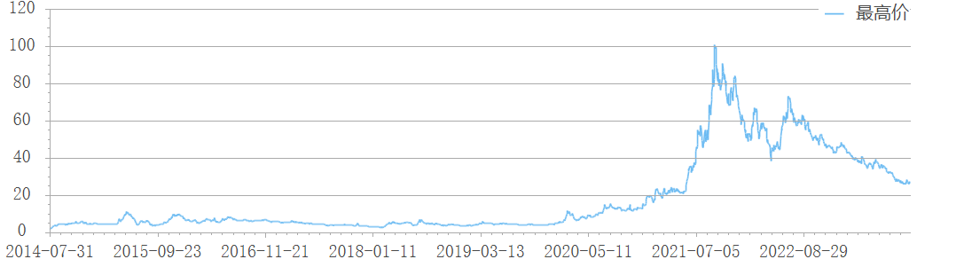 该公司股价于2021年9月10日攀至顶峰,达100.8元(前复权),此后股价震荡下跌,于2022年7月4日反弹至小高峰72.94元/股(前复权),此后股价便一路下跌。2023年10月25日收盘于26.03元(前复权),距离股价最高点已跌去74%。