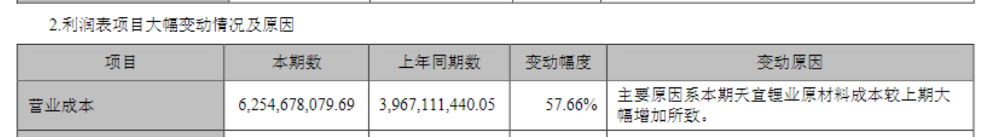 净利大降的一大原因是天宜锂业原材料成本较上期大幅增加。2023年前三季度公司营业成本达62.54亿元,去年同期仅为39.67亿元,同比暴增57.66%。