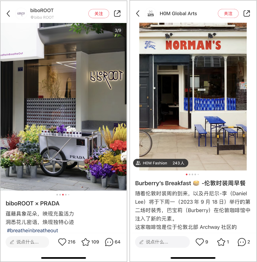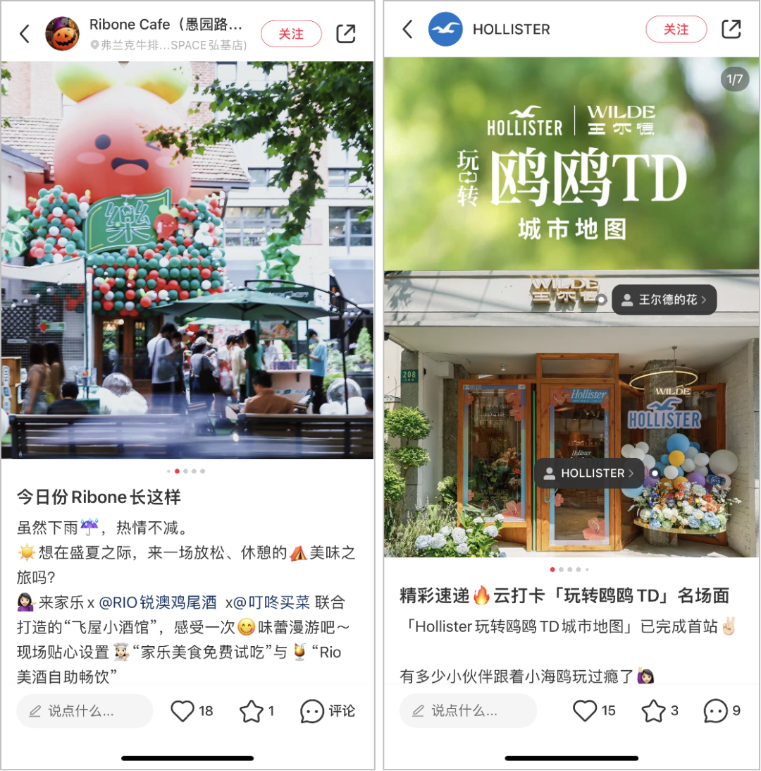 抵进街区的方式不仅是开店,今年我们就发现,在上海有越来越多的品牌通过快闪、与小店合作等方式进入街区。比如与Prada合作种子计划的上海王尔德书店,也在今年跟Hollister、科颜氏合作,消费者可以到店打卡领取鲜花。位于上海愚园路的Ribone Cafe则会不定期与品牌合作快闪,通过店招或产品合作为品牌做宣传。
