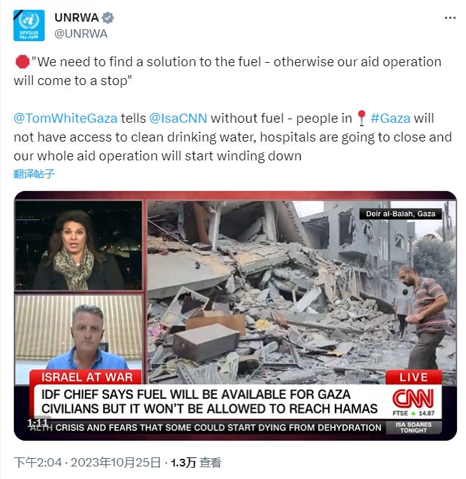 联合国近东巴勒斯坦难民救济和工程处周三在社交媒体平台发文警告,如果再不解决燃油问题,该机构将被迫终止在加沙的援助行动。